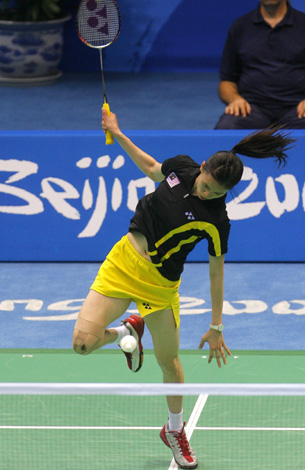 8月13日,馬來西亞名將黃妙珠在女子單打1/4決賽中,以0比2負于中國選手盧蘭,無緣半決賽。圖為黃妙珠接球失誤如同用腳踢球。