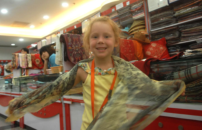 8月13日,在北京紅橋市場(chǎng),一名美國(guó)小游客身披絲巾興奮地跳舞。