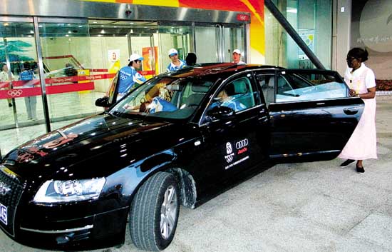 >> 夜幕下,一起大眾汽車將奧運官員送抵運動場