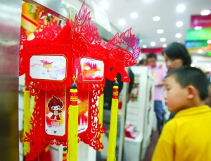在北京奧運會特許商品旗艦店里,福娃可多了,有瓷質(zhì)的,有玉的,還有PU革、絲綢的……小小的福娃鑰匙扣、福娃中國結(jié)、紅色的福娃宮燈、福娃風(fēng)箏、金屬的福娃小火車(每個吉祥物一列車廂)……讓人眼花繚亂,價格非常多樣化,檔次齊全,便宜的像福娃屏幕擦,2塊錢一個,鑰匙扣,20多塊錢,呵呵,最貴的可要算紅木架子上的5個玉福娃了,標(biāo)價29萬元,相當(dāng)于近6萬元一個。