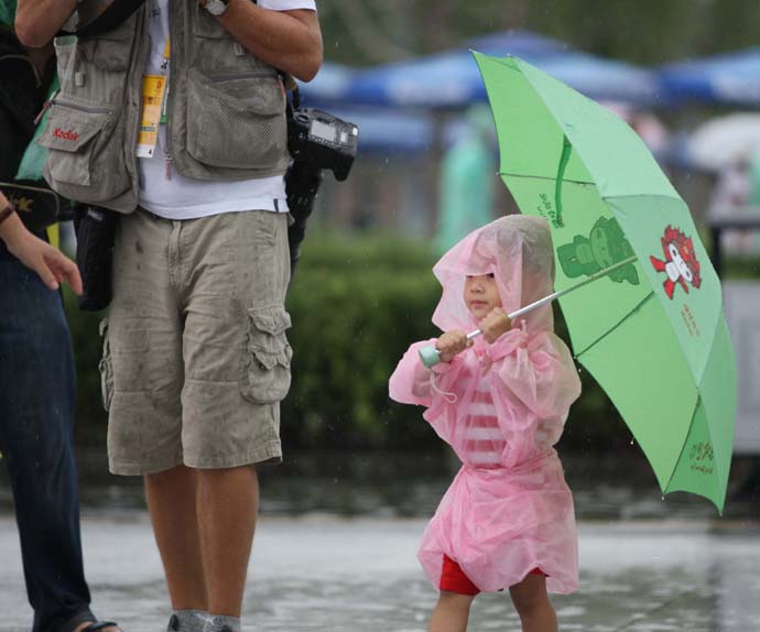 8月14日,一名兒童走在雨中的奧林匹克公園。