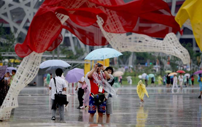 當(dāng)日,北京下起大雨,雨中的奧林匹克公園別有一番情趣。