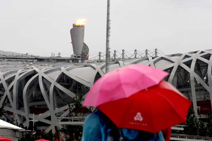 8月14日,游人在雨中觀看奧運(yùn)會(huì)主火炬。