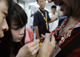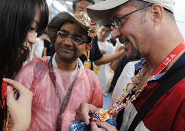 8月14日,在北京地鐵里,“章迷”們在互換奧運紀念章。奧運會,也是來自世界各地的奧運紀念章迷們的盛會。大家在北京互換紀念章,“以章會友”,共同享受奧運帶來的快樂。