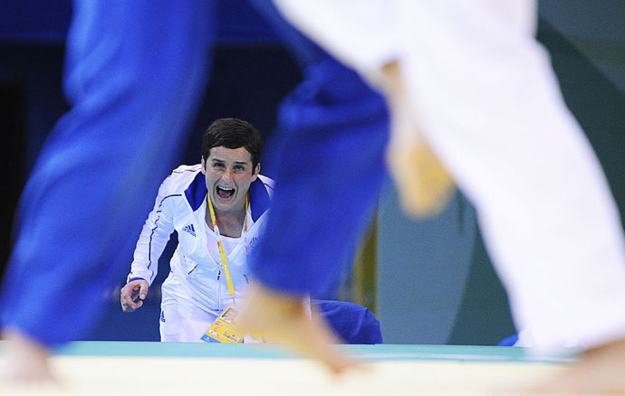 8月14日,在北京科技大學體育館舉行的北京奧運會柔道女子78公斤級一場三四名決賽中,法國選手斯特凡妮·波薩馬伊的教練在場外大聲指導。法國選手斯特凡妮·波薩馬伊在本場比賽中戰(zhàn)勝西班牙選手埃絲特·圣米格爾,獲得銅牌。