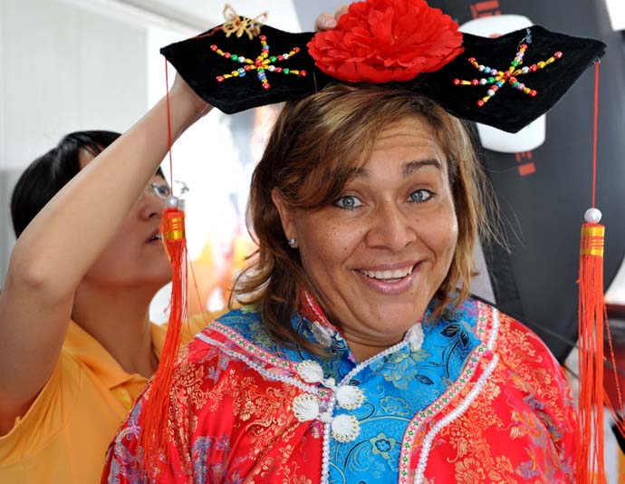 北京奧運村商業(yè)文化街照相館里的中國古代服飾受到外國賓客的青睞。