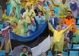 8月14日,觀眾在朝陽公園沙灘排球場(chǎng)冒雨觀看比賽。當(dāng)日,北京奧運(yùn)會(huì)沙灘排球小組賽在這里舉行,盡管北京降雨,卻依然擋不住沙排球迷的熱情。