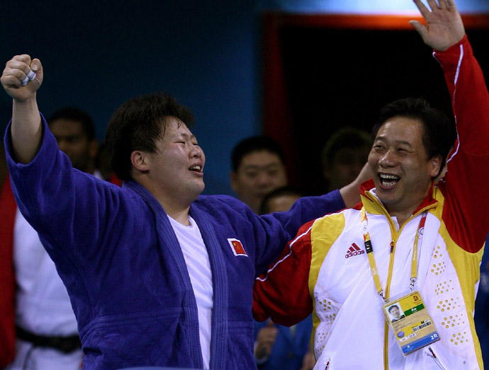 8月15日,佟文(左)在獲勝后興奮地歡呼。當(dāng)日,在北京奧運(yùn)會(huì)柔道女子78公斤以上級(jí)決賽中,中國(guó)選手佟文戰(zhàn)勝日本選手塚田真希,奪得冠軍。