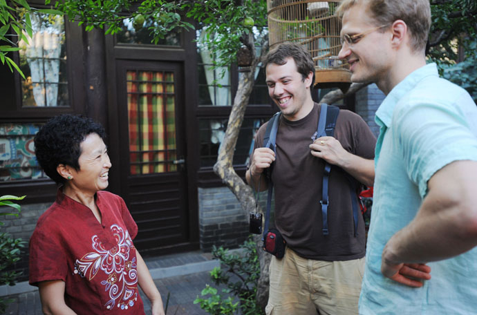 8月15日,什剎海大金絲胡同12號“奧運人家”女主人王志喜用流利的英文向美國游客介紹中國建筑文化。8月8日北京奧運會開幕后,北京市的“奧運人家”成為中外游客的關(guān)注焦點。位于什剎海附近的“奧運人家”游客絡(luò)繹不絕,游客在這里能夠深切感受到老北京所特有的皇城文化與傳統(tǒng)特色。