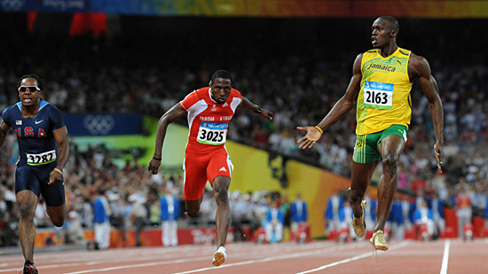 一股黑色旋風(fēng)瞬間掠過“鳥巢”的紅色跑道,牙買加“奇人”博爾特最終用實(shí)力證明他是世界上跑得最快的人。 16日晚,在全場(chǎng)驚爆的歡呼聲中,他僅用了9秒69的時(shí)間到達(dá)了100米跑道的終點(diǎn),并刷新了自己2個(gè)多月前創(chuàng)下的9秒72的世界紀(jì)錄,一舉奪得北京奧運(yùn)會(huì)男子100米冠軍。 特立尼達(dá)和多巴哥的湯普森以9秒89摘得銀牌;美國(guó)人迪克斯贏得銅牌,成績(jī)?yōu)?秒91。 16日晚在“鳥巢”內(nèi)上演的“飛人大戰(zhàn)”決賽,幾乎成了博爾特一個(gè)人的表演。而就在兩個(gè)多月前,博爾特剛以9秒72打破了鮑威爾9秒74的世界紀(jì)錄。 在半決賽中跑出9秒85的博爾特,當(dāng)晚站在“飛人大戰(zhàn)”決賽第4道。決賽中,22歲的博爾特并未給對(duì)手以機(jī)會(huì),如同離弦之箭第一個(gè)沖向百米跑道的終點(diǎn)。 他的同胞、前世界紀(jì)錄保持者鮑威爾則排名第五,成績(jī)?yōu)?秒95。 半決賽16位選手中,有6位跑進(jìn)了10秒大關(guān),進(jìn)入男子100米決賽的門檻為10秒03。賽前的奪冠熱門、美國(guó)“飛人”蓋伊在半決賽中僅跑出10秒05的成績(jī),排位小組第五,無(wú)奈憾別“飛人大戰(zhàn)”決賽跑道。