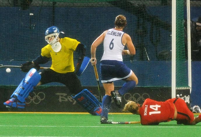 8月10日,英國(guó)隊(duì)守門員貝絲·斯托里(左)在比賽中撲救失利。當(dāng)日,在北京奧運(yùn)會(huì)女子曲棍球預(yù)賽中,德國(guó)隊(duì)以5以1戰(zhàn)勝英國(guó)隊(duì)。