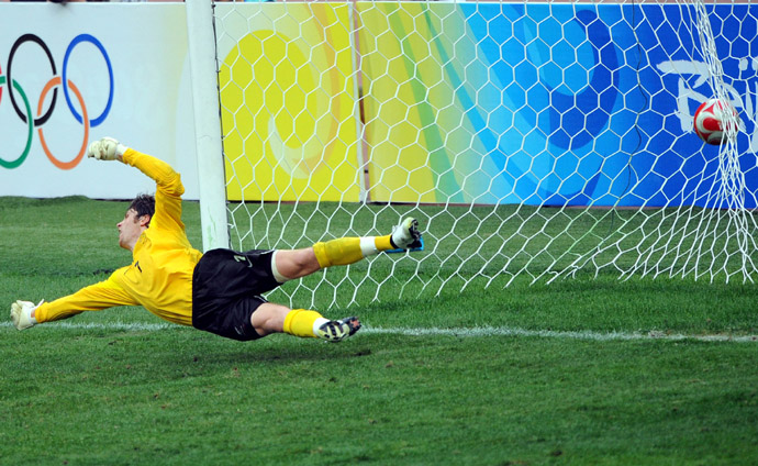 8月10日,新西蘭國奧隊(duì)門將斯普利在撲救巴西隊(duì)球員羅納爾迪尼奧的點(diǎn)球中失利。當(dāng)日,在沈陽奧體中心舉行的奧運(yùn)會男子小組賽C組比賽中,巴西國奧隊(duì)以5比0戰(zhàn)勝新西蘭國奧隊(duì)。