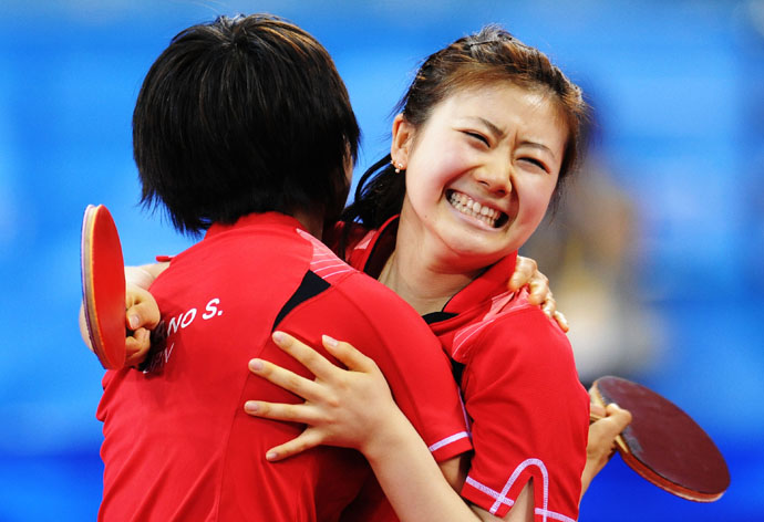 8月16日,日本選手福原愛與隊(duì)友相擁而慶。當(dāng)日,日本隊(duì)在北京奧運(yùn)會(huì)乒乓球女子團(tuán)體銅牌附加賽第2輪中以3比2戰(zhàn)勝中國香港隊(duì),將于17日與韓國隊(duì)爭(zhēng)奪銅牌。