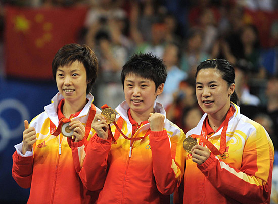 在17日晚舉行的北京奧運(yùn)會(huì)乒乓球女子團(tuán)體決賽中,中國(guó)隊(duì)擊敗新加坡隊(duì)獲得金牌。 第一盤由中國(guó)隊(duì)的王楠對(duì)陣新加坡隊(duì)的馮天薇,王楠在先失一局的情況下連扳三局,以3:1戰(zhàn)勝對(duì)手為中國(guó)隊(duì)拿下第一分。 第二盤比賽中,世界排名第一的張怡寧出場(chǎng),迎戰(zhàn)世界排名第六的新加坡名將李佳薇。張怡寧延續(xù)了隊(duì)友王楠的獲勝軌跡,第一局9:11失利,然后連勝三局,以3:1取得第二盤的勝利。 在第三盤雙打比賽中,由中國(guó)隊(duì)的張怡寧/郭躍對(duì)陣新加坡隊(duì)的李佳薇/王越古,張怡寧/郭躍直落三局以3:0取勝。 中國(guó)隊(duì)最終以總比分3:0戰(zhàn)勝新加坡隊(duì),獲得北京奧運(yùn)會(huì)乒乓球女子團(tuán)體金牌。
