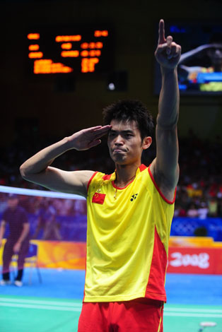 8月17日,中國(guó)選手林丹獲勝后敬禮向觀眾致意。