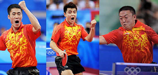 中國(guó)乒乓球隊(duì)18日晚改寫歷史,于北京奧運(yùn)會(huì)乒乓球男子團(tuán)體決賽中3:0擊敗德國(guó)隊(duì),奪得國(guó)球歷史上的第18枚奧運(yùn)金牌。 四年前在雅典,張怡寧為中國(guó)代表團(tuán)摘得第一百枚夏季奧運(yùn)會(huì)金牌,而王皓卻決賽負(fù)于柳承敏,丟掉分量最重的男單冠軍;四年后奧運(yùn)來(lái)到北京,中國(guó)乒乓球隊(duì)在自己的家門口續(xù)寫輝煌。 這也是世界杯冠軍王皓的第一塊奧運(yùn)會(huì)金牌。2000年悉尼奧運(yùn)會(huì)上,王勵(lì)勤與閻森搭檔曾奪得一枚男子雙打金牌;馬琳則與陳?配對(duì),在2004年雅典奧運(yùn)會(huì)上擊敗中國(guó)香港的李靜/高禮澤,獲得男雙冠軍。 有了這枚男團(tuán)金牌,兩年前在同一天完成人生另一個(gè)重大典禮的國(guó)乒男隊(duì)主教練劉國(guó)梁,也為曾經(jīng)同是乒乓球國(guó)手的妻子王瑾獻(xiàn)上了最好的結(jié)婚紀(jì)念日禮物。 18日晚的決戰(zhàn)中,劉郎妙計(jì)再生威,王皓打頭陣、馬琳“捉”波爾的布陣效果頗佳,王勵(lì)勤/王皓的雙打?qū)嵙τ肿銐蚨糁撇?許斯。在中國(guó)組合面前,這對(duì)贏得過(guò)世乒賽亞軍的“歐洲第一雙打”只搶到首局機(jī)會(huì),以13:11、5:11、8:11、7:11告負(fù)。 其實(shí),在鉆石級(jí)強(qiáng)手面前,是金子也會(huì)被掩去光芒。當(dāng)奧恰洛夫遇見當(dāng)今世界男乒第一人王皓,這位未滿20歲的歐洲新星幾乎沒機(jī)會(huì)表現(xiàn),“潛水艇”式發(fā)球產(chǎn)生的積極效果有限,反手優(yōu)勢(shì)也變成對(duì)手眼里的小菜一碟,11:4、11:8、11:7的三局比分輕松吞噬了奧恰洛夫的雄心。 和兩天前半決賽上對(duì)陣韓國(guó)隊(duì)時(shí)極為相似地,中國(guó)隊(duì)決賽中的唯一波折也發(fā)生在馬琳身上。對(duì)陣“歐洲第一人”波爾的第二局中,11:7先下一城的馬琳在急于取勝的焦躁心態(tài)驅(qū)使下自亂陣腳、連連失誤,白送波爾一個(gè)7:1領(lǐng)先的完美開局,雖然馬琳稍后重拾穩(wěn)定發(fā)揮,號(hào)稱“世界第一細(xì)膩”的前三板優(yōu)勢(shì)也屢屢發(fā)揮效用,但在波爾對(duì)其反手的一通連續(xù)猛攻之后,馬琳以8:11失掉了一局。 接下來(lái)的兩局中馬琳持續(xù)穩(wěn)健表現(xiàn),在11:4輕取第三局后,又在第四局中以7:5領(lǐng)先,劉國(guó)梁這時(shí)及時(shí)暫停布置戰(zhàn)術(shù),雖然暫;貋(lái)后馬琳先讓波爾扳回兩分,但此后的一系列攻防則沒讓對(duì)手抓到一點(diǎn)機(jī)會(huì),最后一記勢(shì)大力沉的扣殺甚至讓波爾右手著地險(xiǎn)些跪倒,11:7鎖定勝局。
