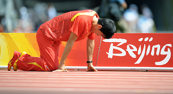 8月18日,中國選手劉翔在比賽前進(jìn)行上場準(zhǔn)備時(shí)感到不適。當(dāng)日,劉翔在北京奧運(yùn)會(huì)男子110米欄第一輪比賽中,因?yàn)槟_跟之傷退出比賽。新華社記者