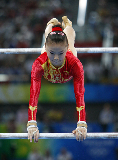 8月18日,中國(guó)選手何可欣在高低杠比賽中。當(dāng)日,在國(guó)家體育館進(jìn)行的北京奧運(yùn)會(huì)體操高低杠決賽中,何可欣以16.725分的成績(jī)奪得冠軍。