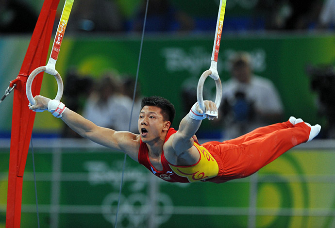 8月18日,中國(guó)選手陳一冰在吊環(huán)決賽中。當(dāng)日,在國(guó)家體育館進(jìn)行的北京奧運(yùn)會(huì)吊環(huán)決賽中,陳一冰以16.600的成績(jī)奪得冠軍。