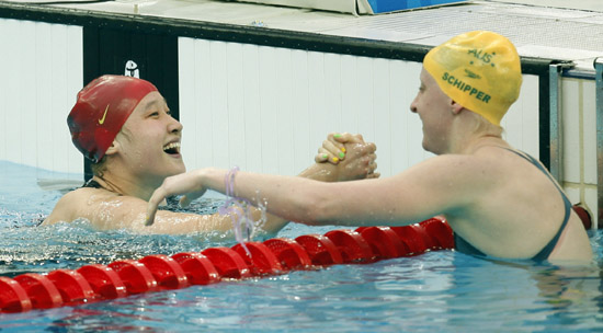 8月14日,中國選手劉子歌(左)接受澳大利亞選手斯基佩爾的祝賀。當(dāng)日,劉子歌在女子200米蝶泳決賽中以2分04秒18的成績創(chuàng)造新的世界紀(jì)錄并奪得冠軍。新華社記者:費(fèi)茂華