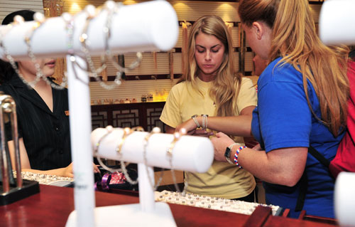 8月17日,兩名外國游客在京城百工坊挑選工藝飾品。