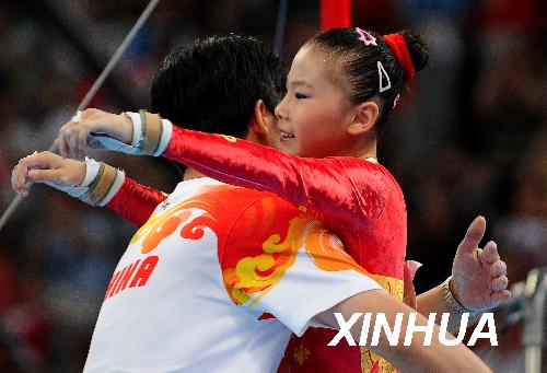 8月18日,中國選手何可欣在完成比賽后與教練擁抱慶祝。當(dāng)日,在國家體育館進(jìn)行的北京奧運會體操高低杠決賽中,何可欣以16.725分的成績奪得冠軍。 新華社記者