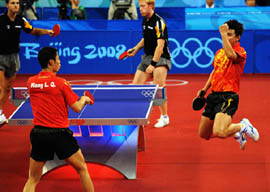8月18日,中國(guó)隊(duì)在北京奧運(yùn)會(huì)乒乓球男子團(tuán)體決賽中以3比0戰(zhàn)勝德國(guó)隊(duì),摘得金牌。