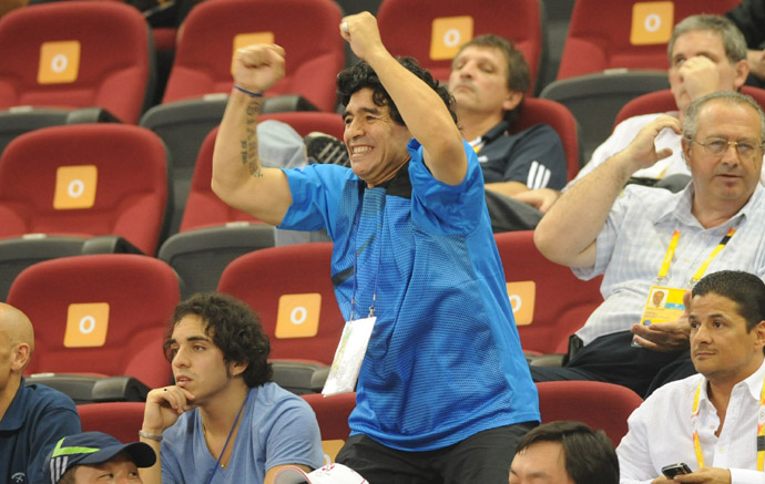 8月18日,阿根廷著名足球明星馬拉多納(中)前來觀看阿根廷男籃與俄羅斯比賽。