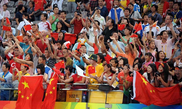8月18日,觀眾在看臺上揮舞五星紅旗,為選手加油助威。當日,北京奧運會體操單項決賽和女子蹦床決賽在國家體育館進行。