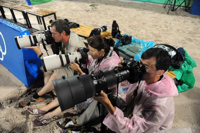 8月18日,新華社哈薩克族攝影記者沙達(dá)提在北京沙灘排球場內(nèi)與美聯(lián)社、法新社等多家媒體一起忙碌地處理圖片。