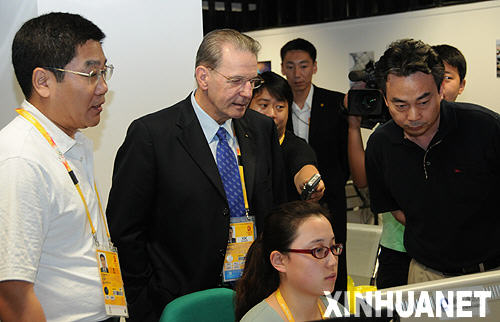國際奧委會主席羅格(中)14日上午參觀位于北京奧運會主新聞中心的新華社奧運前方報道團(tuán),圖為新華社副總編輯彭樹杰(右)向羅格介紹新華社奧運報道情況。新華網(wǎng)記者 胡孝乾