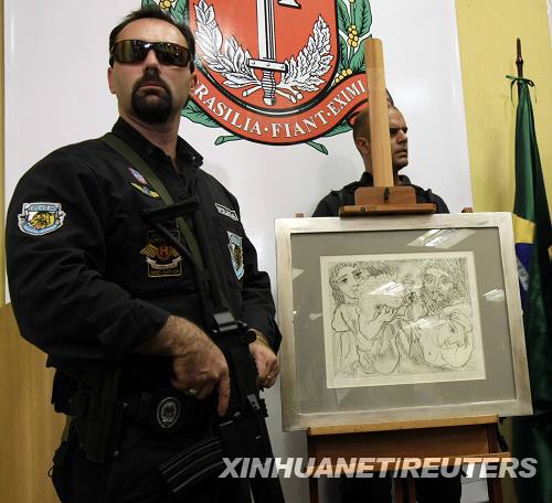 8月18日,巴西警察在巴西圣保羅向人們展示失而復(fù)得的畢加索畫作《彌諾陶洛斯、酒鬼和女人》!稄浿Z陶洛斯、酒鬼和女人》于6月12日在巴西圣保羅一家畫廊被人偷走,當(dāng)時(shí)失竊的還有其它三幅名畫。新華社/路透