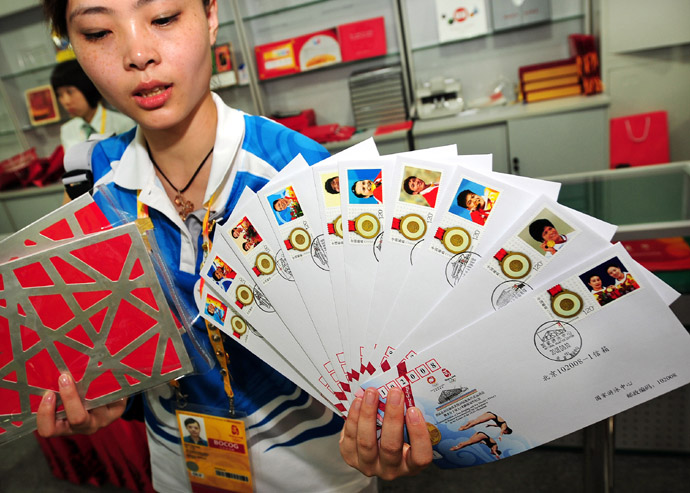 當日,“第29屆奧運會中國體育代表團奪金紀念”郵品在北京奧運村的中國郵政代辦點開始發(fā)售。郵品中的紀念封正面印有運動員比賽精彩瞬間和賽場圖片,加蓋奧運場館郵戳,并貼有奪金運動員個性化郵票。