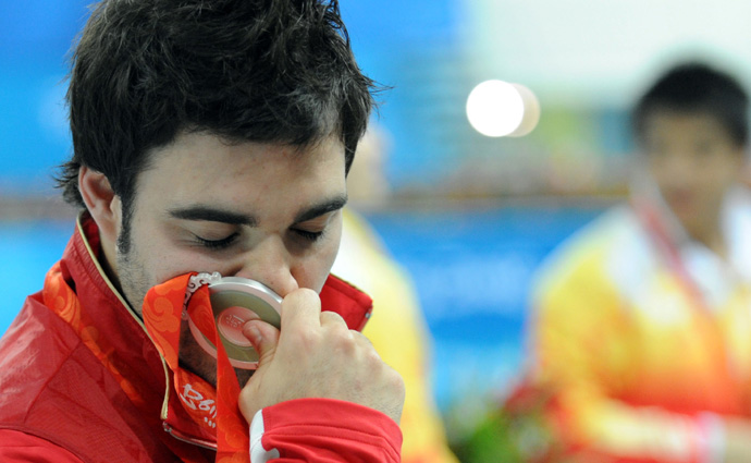 8月19日,加拿大選手德斯帕蒂親吻獎(jiǎng)牌。當(dāng)日,北京奧運(yùn)會(huì)跳水比賽在國家游泳中心——“水立方”繼續(xù)進(jìn)行,德斯帕蒂在男子3米跳板決賽中以536.65分的成績獲得亞軍。
