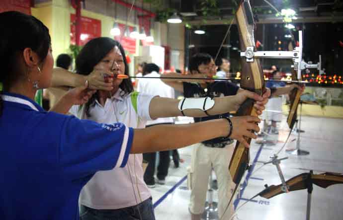 8月19日,幾位業(yè)余射手在北京東方巨龍射箭館練習(xí)。據(jù)這個(gè)射箭館的工作人員介紹,由于中國(guó)女子射箭在北京奧運(yùn)會(huì)上取得歷史性突破,北京射箭愛(ài)好者近日逐漸增多。他們紛紛來(lái)到向社會(huì)開(kāi)放的射箭場(chǎng)館一試身手。
