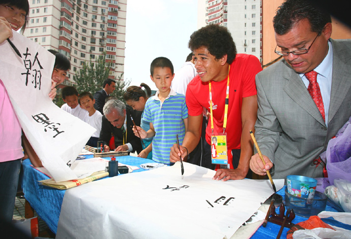 8月19日,智利運動員埃利奧特(右二)在學(xué)寫毛筆字。當(dāng)日,幾位參加北京奧運會的智利客人來到“同心結(jié)”學(xué)校——西羅園五小參觀,向孩子們學(xué)習(xí)剪紙、捏面人和書法等中國傳統(tǒng)藝術(shù)。