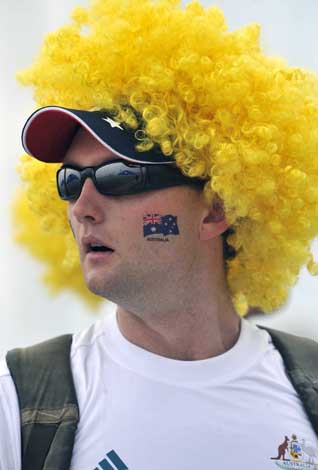 8月19日,一位澳大利亞“船迷”頭戴黃色假發(fā)。