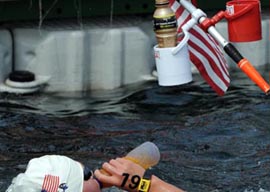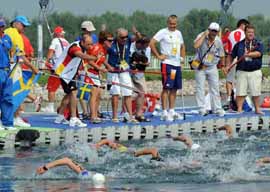 北京奧運(yùn)會(huì)馬拉松游泳比賽在順義奧林匹克水上公園的直道水道上往返進(jìn)行,在兩頭的轉(zhuǎn)彎處都設(shè)有“補(bǔ)給站”——一個(gè)巨大的固定在岸邊的塑料筏子。教練們站在筏子上把食物、飲料裝在瓶子里挑在竿頭,懸在選手經(jīng)過(guò)的水道上空,樣子很像是在釣魚。 一些選手經(jīng)過(guò)“補(bǔ)給站”時(shí),伸手取下瓶子,吃上幾口就把瓶子扔在水里。有的人拿到瓶子后還沒吃到嘴,就被別人打掉在水里。不過(guò),因?yàn)楹ε碌⒄`時(shí)間或喪失優(yōu)勢(shì)位置,大多數(shù)選手都沒有伸手取物。此外,不少選手都在泳衣縫里別上小號(hào)的塑料包裝食品或者飲料。