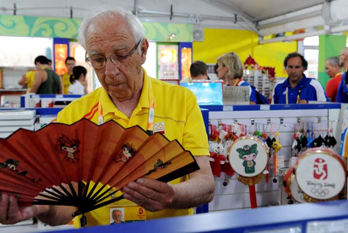 8月20日,一位西班牙老人在北京奧運(yùn)村商業(yè)文化街選購(gòu)?qiáng)W運(yùn)紀(jì)念品。隨著北京奧運(yùn)會(huì)比賽項(xiàng)目逐個(gè)結(jié)束,北京奧運(yùn)村商業(yè)文化街特許商品生意更加紅火,來(lái)自世界各地的賓朋紛紛來(lái)到這里選購(gòu)?qiáng)W運(yùn)紀(jì)念品。