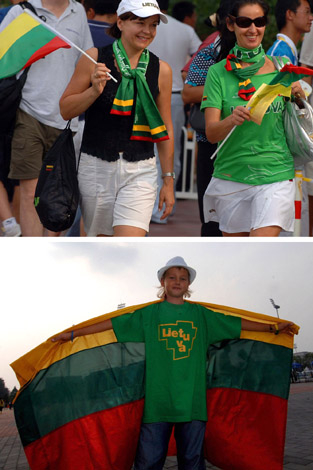 8月20日,立陶宛球迷揮舞國旗為自己的球隊助威(拼版照片)。當(dāng)日,中國男子籃球隊在北京奧運會男子籃球四分之一決賽中迎戰(zhàn)立陶宛隊。這場比賽吸引了大批中國和立陶宛的球迷觀看,為球員加油助威。