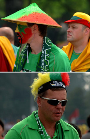 8月20日,“濃妝艷抹”的立陶宛球迷為自己的球隊(duì)加油助威(拼版照片)。當(dāng)日,中國男子籃球隊(duì)在北京奧運(yùn)會(huì)男子籃球四分之一決賽中迎戰(zhàn)立陶宛隊(duì)。這場(chǎng)比賽吸引了大批中國和立陶宛的球迷觀看,為球員加油助威。