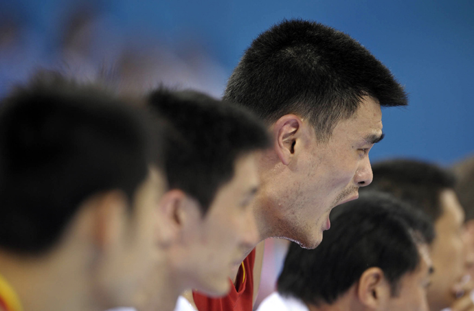 8月20日,在北京五棵松奧林匹克籃球館進(jìn)行的北京奧運(yùn)會(huì)男籃1/4決賽中,中國(guó)隊(duì)以68比94不敵立陶宛隊(duì)。這是中國(guó)男籃隊(duì)員姚明在場(chǎng)邊吶喊。
