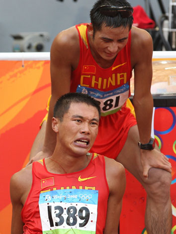 8月22日,中國選手司天峰(下)與李建波在比賽后。當(dāng)日,司天峰在北京奧運(yùn)會男子50公里競走比賽中獲得第17名,李建波獲得第14名。