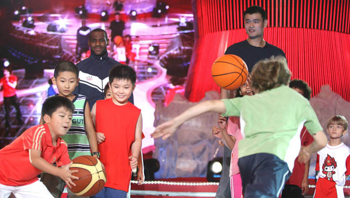 8月21日,在北京世貿(mào)天階奧運(yùn)文化廣場(chǎng),姚明與NBA巨星詹姆斯帶領(lǐng)小朋友進(jìn)行互動(dòng)游戲,并與市民和游客共同分享奧運(yùn)帶來(lái)的歡樂(lè)。