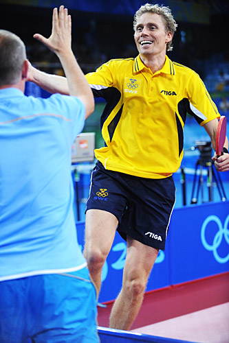 已經(jīng)42歲的佩爾森22日下午4:1擊敗39歲的普里莫拉茨,贏得了在北京奧運(yùn)會乒乓球男子單打半決賽中與中國頭號種子王皓對陣的機(jī)會。 作為前瑞典“三駕馬車”之一,曾和乒壇“常青樹”瓦爾德內(nèi)爾并肩作戰(zhàn)多年的佩爾森在這場“六朝元老”之間的對決中又找回了過去的感覺,而他在開局落后時所表現(xiàn)出的韌性和耐性,更與雅典奧運(yùn)會上還打進(jìn)半決賽的瓦爾德內(nèi)爾如出一轍。 這場比賽最終戰(zhàn)成5局,比分是7:11、11:6、11:8、14:12、11:9。關(guān)鍵性的第四局中,佩爾森原本以10:5領(lǐng)先,卻被反手技術(shù)占優(yōu)的普里莫拉茨連扳6分,以11:10反超。此后,比賽在雙方均無失誤的情況下進(jìn)入拉鋸戰(zhàn),而佩爾森最終證明自己是堅持得更久的那一個。 賽后佩爾森對自己的表現(xiàn)極為滿意:“我打得很好,進(jìn)攻很主動,關(guān)鍵是我打了這么多年,很明白怎樣才能贏球,希望明天對王皓我也能發(fā)揮這么好,我知道我在北京有很多粉絲,也許沒老瓦那么多,但我會好好表現(xiàn)的! 評價本輪對手時,佩爾森甚至開起了普里莫拉茨的玩笑:“我們已經(jīng)交手了這么多年,彼此之間都太了解了,我很高興自己能贏得這么艱苦的比賽,但又為老普難過,他7次試圖翻盤,可惜都沒成功。” 對于“高齡”的質(zhì)疑,佩爾森很肯定地回答:“年齡不是問題,大家都看到了,我步伐很快,身體完全沒問題!钡(dāng)問起他是否還會參加四年后的倫敦奧運(yùn)會時,這位年齡恰好與老瓦宣布退役時相同的老將說:“哦,是的,這將是我的最后一次奧運(yùn)會了,我參加了有乒乓球以來的全部六屆奧運(yùn)會,我想這夠了!彪m然不再參加奧運(yùn)會了,但佩爾森表示,是否參加十月份歐洲錦標(biāo)賽的問題,他還要回去和教練林德好好商量一下。 作為上世紀(jì)80年代末的世乒賽亞軍、90年代初的世界杯賽冠軍,佩爾森曾在2000年悉尼奧運(yùn)會上擊敗風(fēng)頭正勁的中國選手劉國正晉級,直到半決賽中負(fù)于后來奪冠的孔令輝,他才停住前進(jìn)的腳步。 四年前老瓦在雅典殺進(jìn)半決賽時就曾驚碎眾多眼鏡,如今同樣高齡的佩爾森即將對陣王皓,他能否取得超過老瓦的成就?佩爾森頗給自己留余地地說:“2003年的施拉格和2004年的柳承敏都搶了中國人的冠軍,但他們都沒長久,中國人還是統(tǒng)治乒壇。如今馬琳和王皓的反手都進(jìn)步了不少,王勵勤也證明了他的反手很好,這對歐洲人來說會更難取勝。所以我說打破中國這面‘墻’是非常困難的,但也不是完全沒有可能。歷史上拿到奧運(yùn)會男單冠軍的有兩個中國人、兩個韓國人,還有一個瑞典人,我想我還有機(jī)會! 輸了球的普里莫拉茨表現(xiàn)得仍然紳士,他祝賀佩爾森的同時也說:“他表現(xiàn)得很好,而我也不是很失望,因?yàn)檫@已經(jīng)是我的第六屆奧運(yùn)會了,帶著這樣的成績回家,克羅地亞人會很高興。”讓他評價中國選手的實(shí)力,他說:“在乒乓球這個項目上,以前歐洲領(lǐng)先過,但看看現(xiàn)在,王勵勤的弧圈比我們更有力,步伐比我們更快,這很說明問題。” 距離佩爾森和普里莫拉茨的這場四分之一決賽開始還有半個小時的時候,十幾名身穿黃色球衫、手舉藍(lán)色黃十字國旗的瑞典奧運(yùn)代表團(tuán)成員,他們在看臺上做出各種有趣的助威動作,使北京大學(xué)體育館里自開賽以來第一次有了“加油”之外的異國歌聲,也為佩爾森和普里莫拉茨這場經(jīng)典之戰(zhàn)添加了色彩。