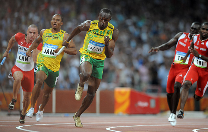 8月22日,牙買加隊(duì)選手尤塞恩·博爾特(前)在比賽中。當(dāng)日,牙買加隊(duì)在北京奧運(yùn)會(huì)男子4×100米接力決賽中以37秒10的成績(jī)奪得金牌并打破世界紀(jì)錄。