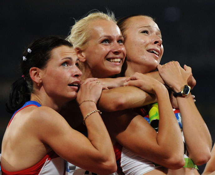8月22日,俄羅斯隊(duì)選手在比賽后觀看成績(jī)。當(dāng)日,俄羅斯隊(duì)在北京奧運(yùn)會(huì)女子4X100米接力決賽中以42秒31的成績(jī)奪得金牌。