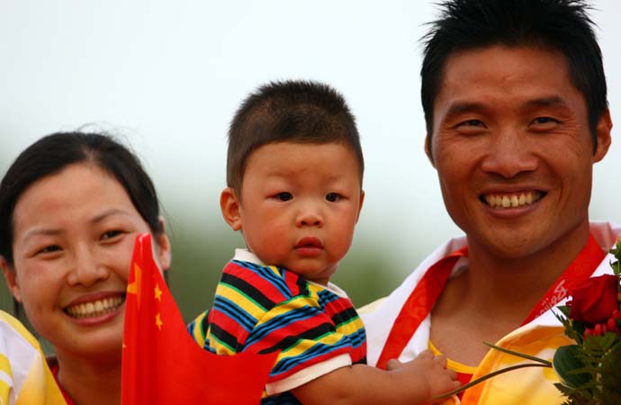 8月23日,北京奧運(yùn)會(huì)皮劃艇靜水男子雙人劃艇500米決賽在順義奧林匹克水上公園舉行,中國(guó)選手孟關(guān)良/楊文軍以1分41秒025的成績(jī)獲得冠軍,成功衛(wèi)冕。這是孟關(guān)良領(lǐng)獎(jiǎng)后與15個(gè)月大的兒子孟裕航、妻子徐鋒月合影。