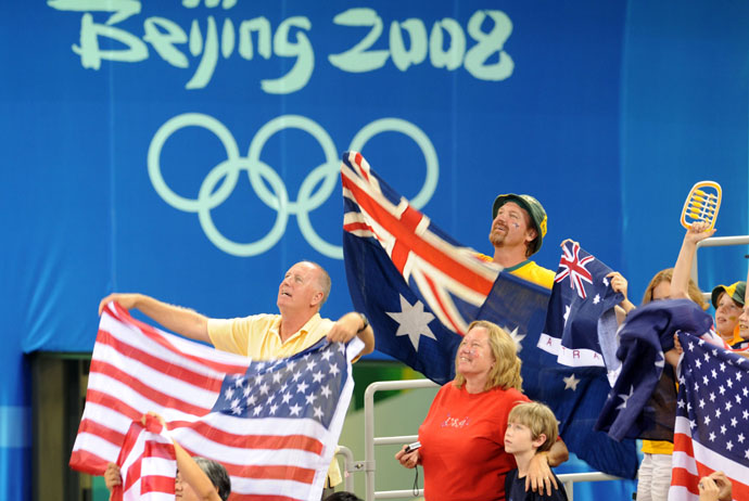8月23日,美國(guó)隊(duì)和澳大利亞隊(duì)球迷在為各自的球隊(duì)加油助威。當(dāng)日,在北京五棵松奧林匹克籃球館進(jìn)行的北京奧運(yùn)會(huì)女籃決賽中,美國(guó)隊(duì)以92比65戰(zhàn)勝澳大利亞隊(duì),獲得冠軍。