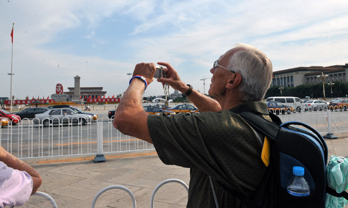 8月23日,一位游客在拍攝天安門廣場。隨著北京奧運(yùn)會即將結(jié)束,大批外國人來到天安門廣場參觀游覽。